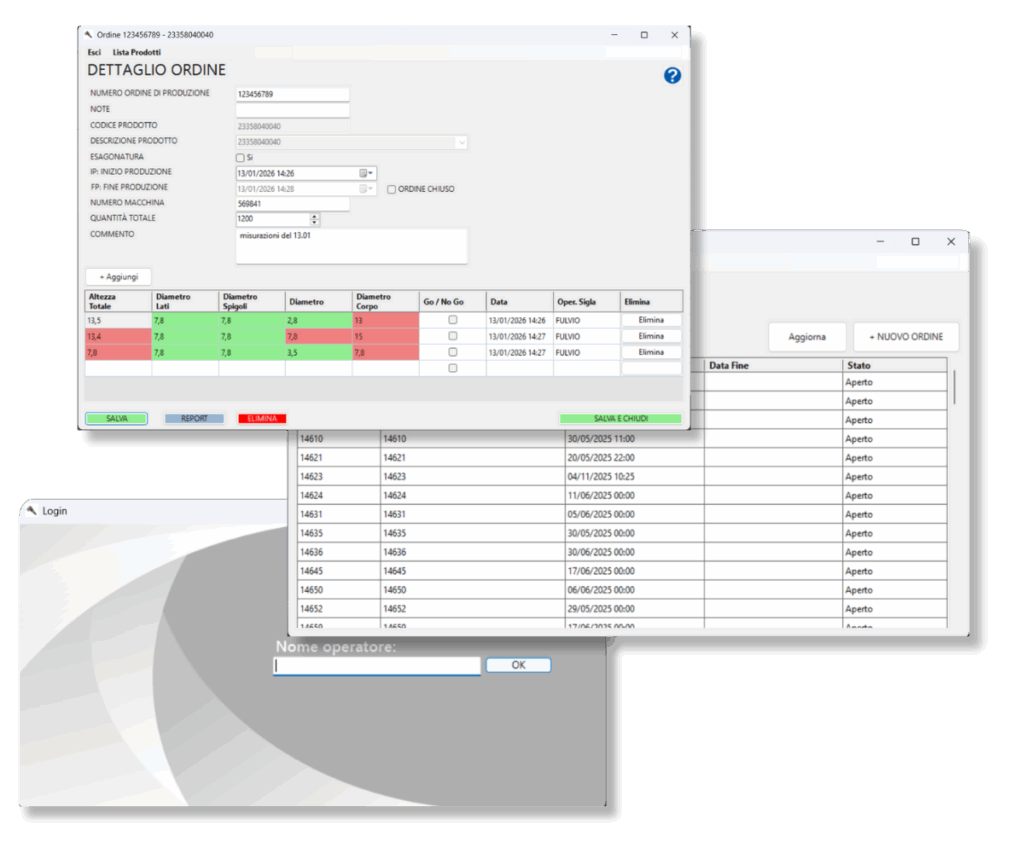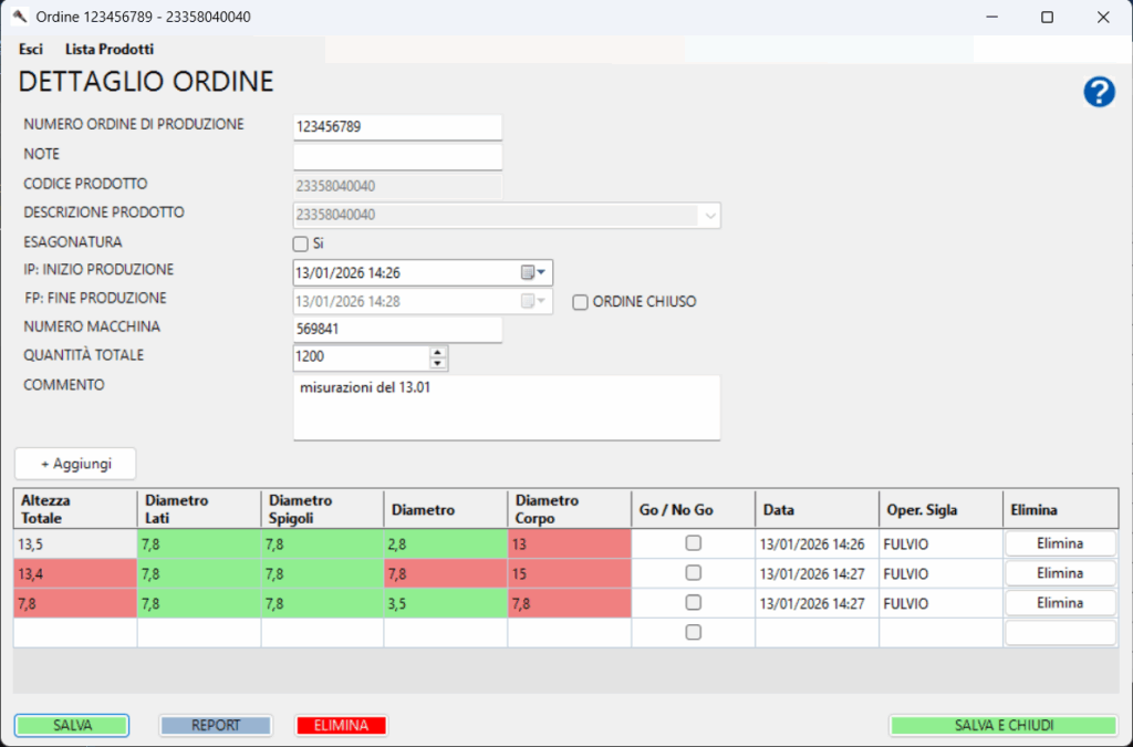 Report completi con misurazioni, commenti, operatori e dati ordine.
